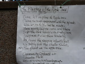 Come, let us plant the apple-tree. Cleave the tough greensward with the spade; Wide let its hollow bed be made; There gently lay the roots, and there Sift the dark mould with kindly care, And press it o'er them tenderly, As, round the sleeping infant's feet, We softly fold the cradle sheet; So plant we the apple-tree. What plant we in this apple-tree? Buds, which the breath of summer days Shall lengthen into leafy sprays; Boughs where the thrush, with crimson breast, Shall haunt and sing and hide her nest; We plant, upon the sunny lea, A shadow for the noontide hour, A shelter from the summer shower, When we plant the apple-tree. What plant we in this apple-tree? Sweets for a hundred flowery springs To load the May-wind's restless wings, When, from the orchard row, he pours Its fragrance through our open doors; A world of blossoms for the bee, Flowers for the sick girl's silent room, For the glad infant sprigs of bloom, We plant with the apple-tree. What plant we in this apple-tree! Fruits that shall swell in sunny June, And redden in the August noon, And drop, when gentle airs come by, That fan the blue September sky, While children come, with cries of glee, And seek them where the fragrant grass Betrays their bed to those who pass, At the foot of the apple-tree. And when, above this apple-tree, The winter stars are quivering bright, And winds go howling through the night, Girls, whose young eyes o'erflow with mirth, Shall peel its fruit by cottage-hearth, And guests in prouder homes shall see, Heaped with the grape of Cintra's vine And golden orange of the line, The fruit of the apple-tree. The fruitage of this apple-tree Winds and our flag of stripe and star Shall bear to coasts that lie afar, Where men shall wonder at the view, And ask in what fair groves they grew; And sojourners beyond the sea Shall think of childhood's careless day And long, long hours of summer play, In the shade of the apple-tree. Each year shall give this apple-tree A broader flush of roseate bloom, A deeper maze of verdurous gloom, And loosen, when the frost-clouds lower, The crisp brown leaves in thicker shower; The years shall come and pass, but we Shall hear no longer, where we lie, The summer's songs, the autumn's sigh, In the boughs of the apple-tree. And time shall waste this apple-tree. Oh, when its aged branches throw Thin shadows on the ground below, Shall fraud and force and iron will Oppress the weak and helpless still? What shall the tasks of mercy be, Amid the toils, the strifes, the tears Of those who live when length of years Is wasting this little apple-tree? "Who planted this old apple-tree?" The children of that distant day Thus to some aged man shall say; And, gazing on its mossy stem, The gray-haired man shall answer them: "A poet of the land was he, Born in the rude but good old times; 'T is said he made some quaint old rhymes On planting the apple-tree." The orchard (behind Mac's papershop on Lamond Dr)is open to all. http://www.standrewsorchardgroup.blogspot.co.uk |