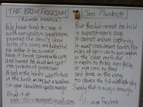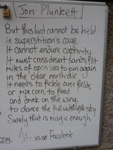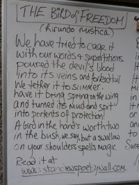 The Bird of Freedom (Hirundo rustica) We have tried to cage it with our words and superstitions, poured the devil's blood into its veins and forked tail. We tether it to summer, have it bring spring on the wing and turned its mud and spit into portents of protection. A bird in the hand's worth two in the bush we say, but a swallow on your shoulder spells magic. But this bird cannot be held in superstition's cage. It cannot endure captivity. It must cross desert sands, flit miles of open sea to join again in the clear north air. It needs to fickle over fields of ripe corn, to feed and drink on the wing, to dance the full width of sky. Surely that is magic enough.